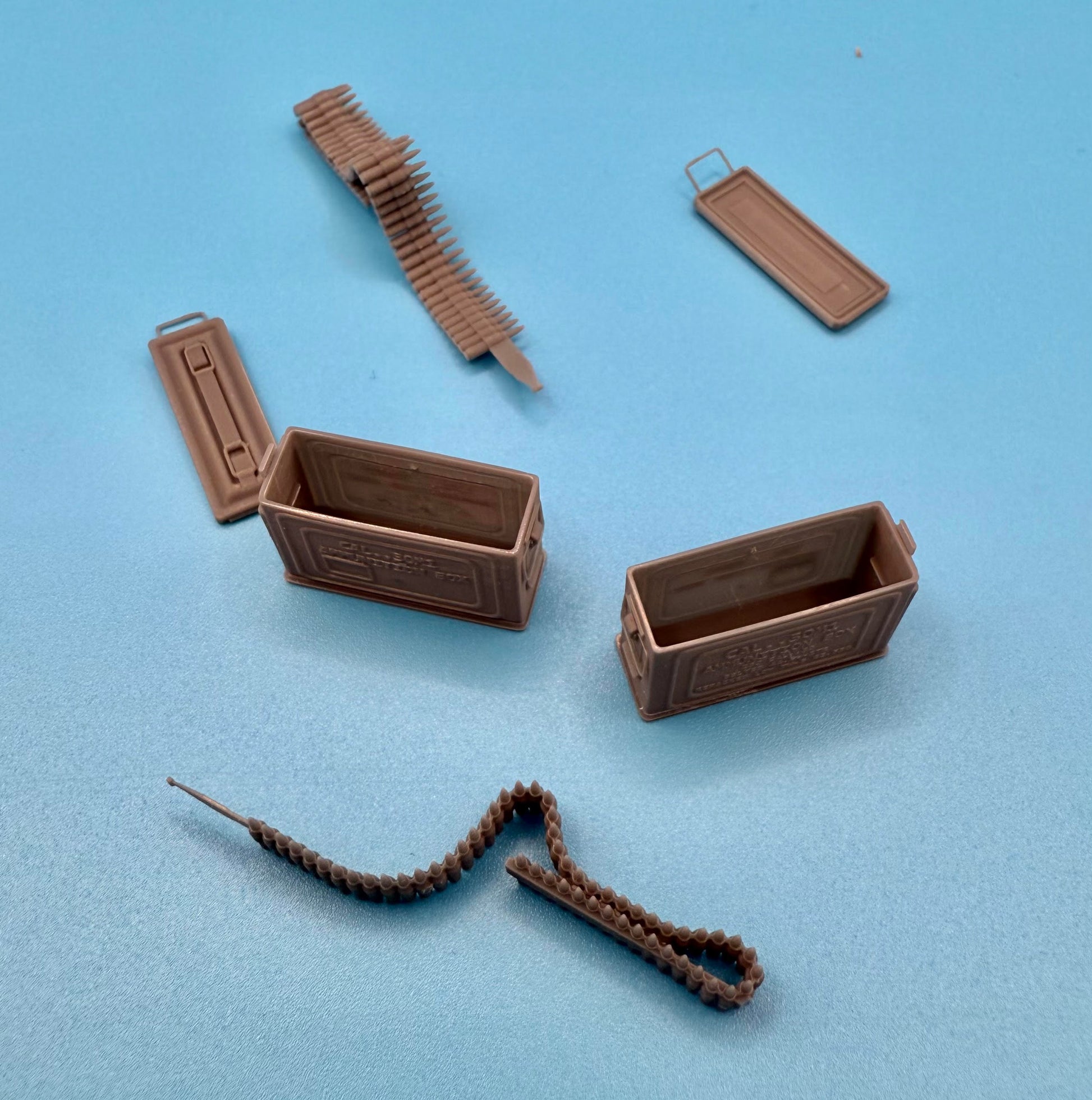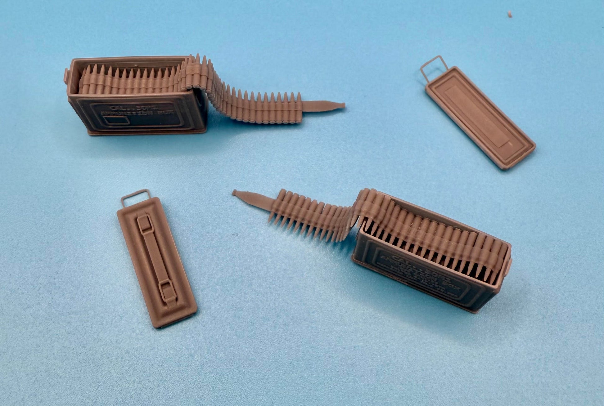 Set of 2: 3D printed ammo cans in open position with separate lid and cartridge belt inserts.
