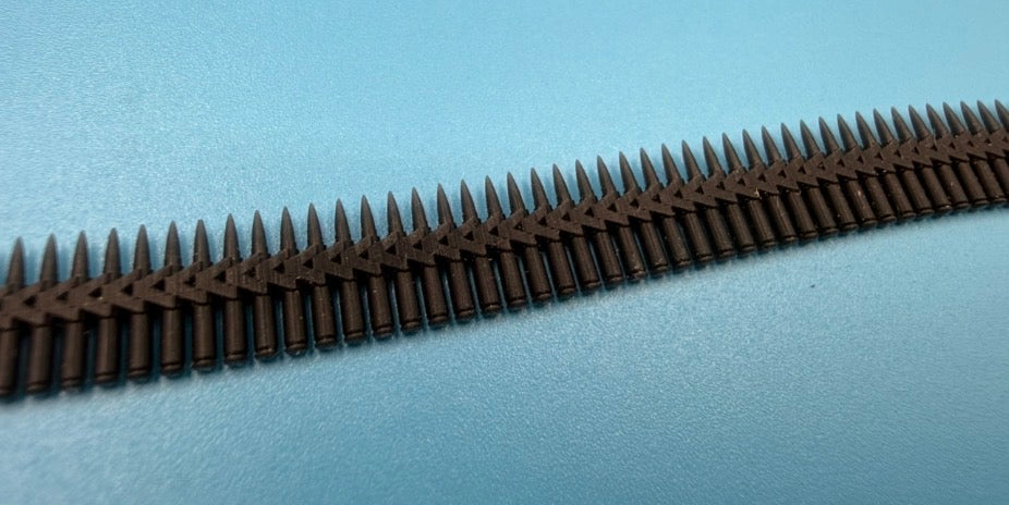 Includes 2 x 100mm strips of 3D printed ammo belts, printed in flexible material.