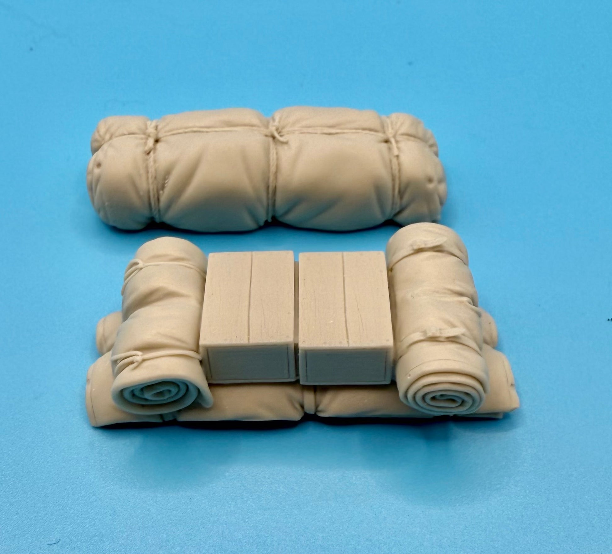 Engine Deck Stowage Assortment Pack for U.S. WW2 armored vehicles in 1/35 scale. Variety pack representing a mixture of different stowage items. Includes stretch of string to simulate tie down rope. 1/35 Scale