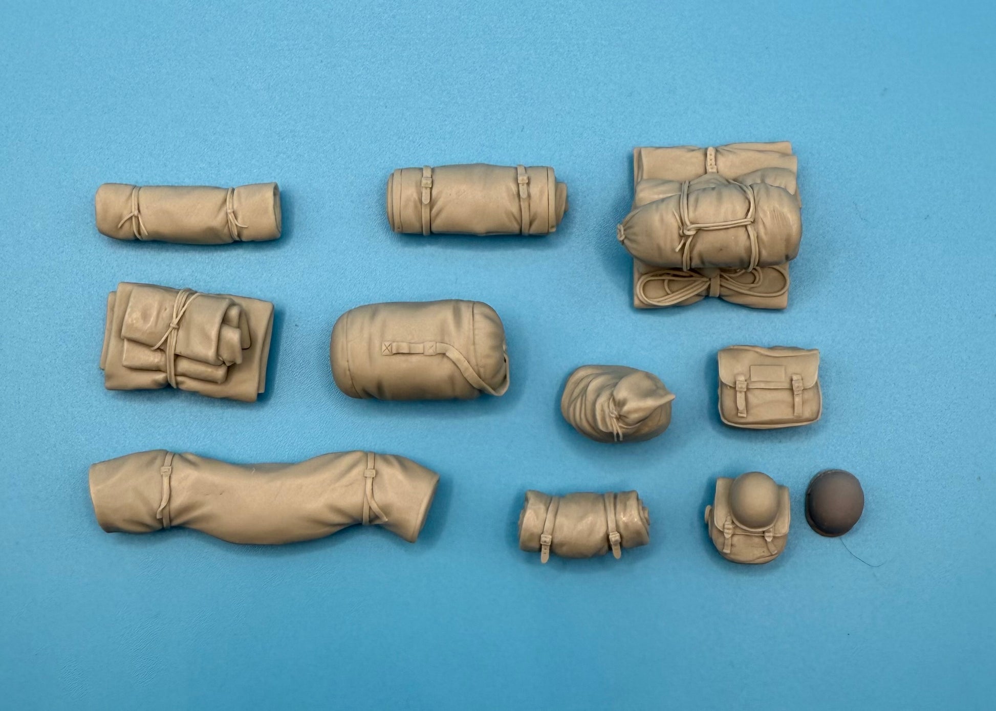 Set #1: Contains 10 U.S. WW2 stowage items including tent packs, bed rolls, tarps and helmet. Very nicely and authentically sculpted and produced in high quality PU resin. Set includes a 3D printed helmet shell. Helmet shell will adapt over moulded helmet liner on one of the bags.